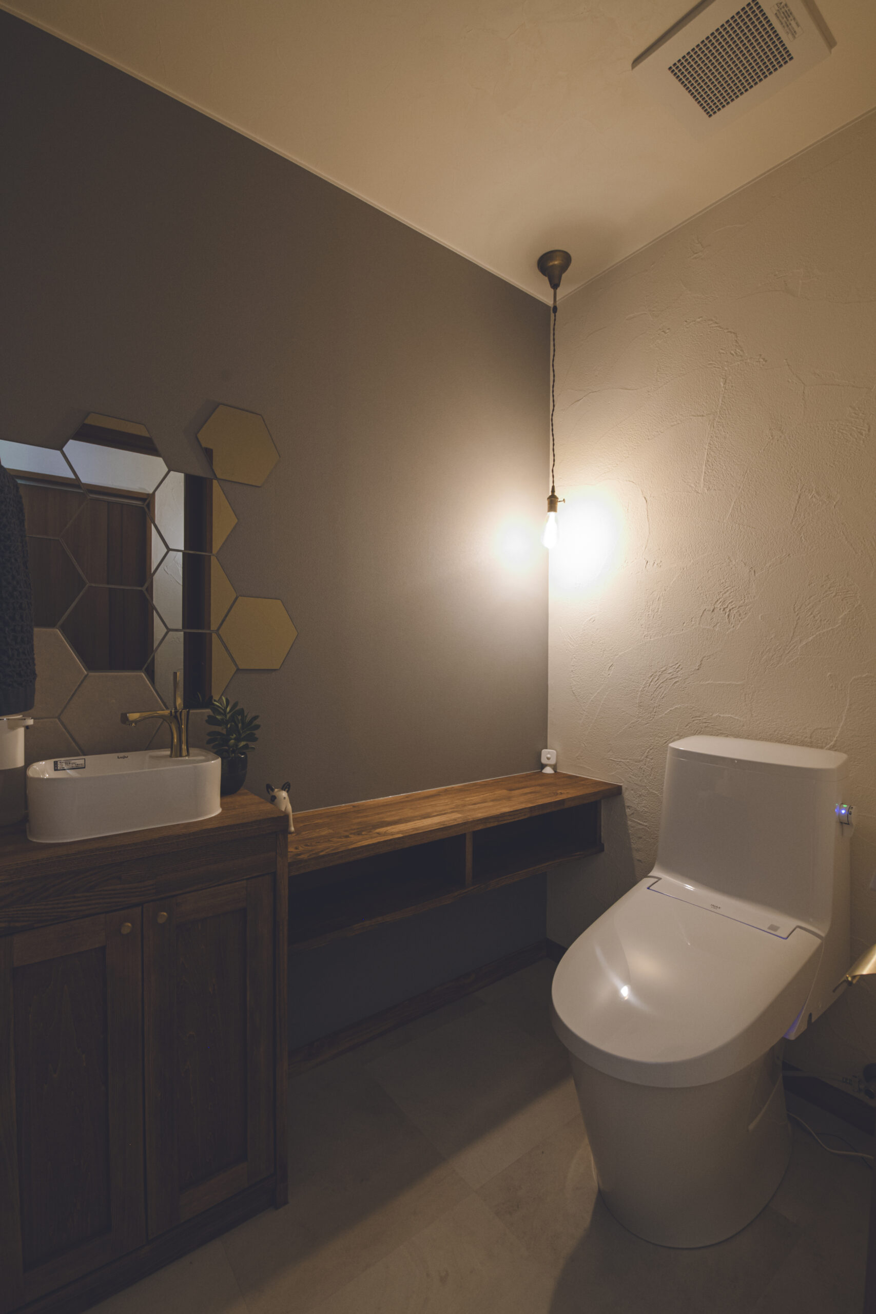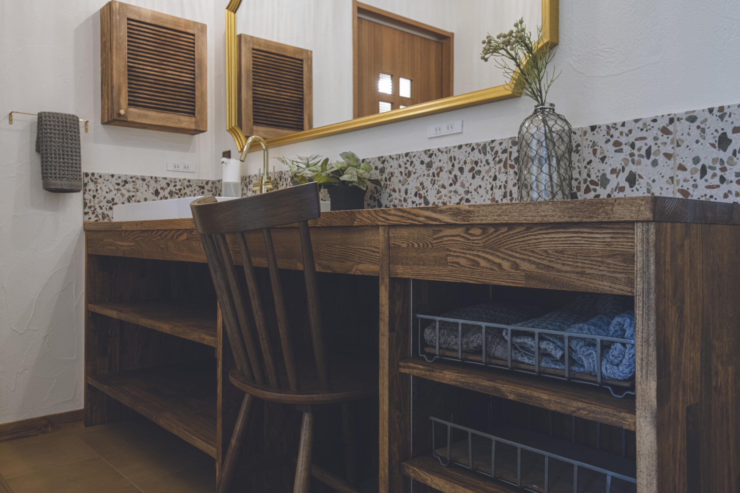 奥様のこだわりがつまった、機能的で美しい造作洗面台。忙しい朝でも二人並んで準備できるよう、ゆとりのある幅を持たせています。座ってメイクをする奥様のために、大きめの鏡をご支給いただき、設置。木の温もりを感じる空間で、毎日の身支度をスムーズにします。