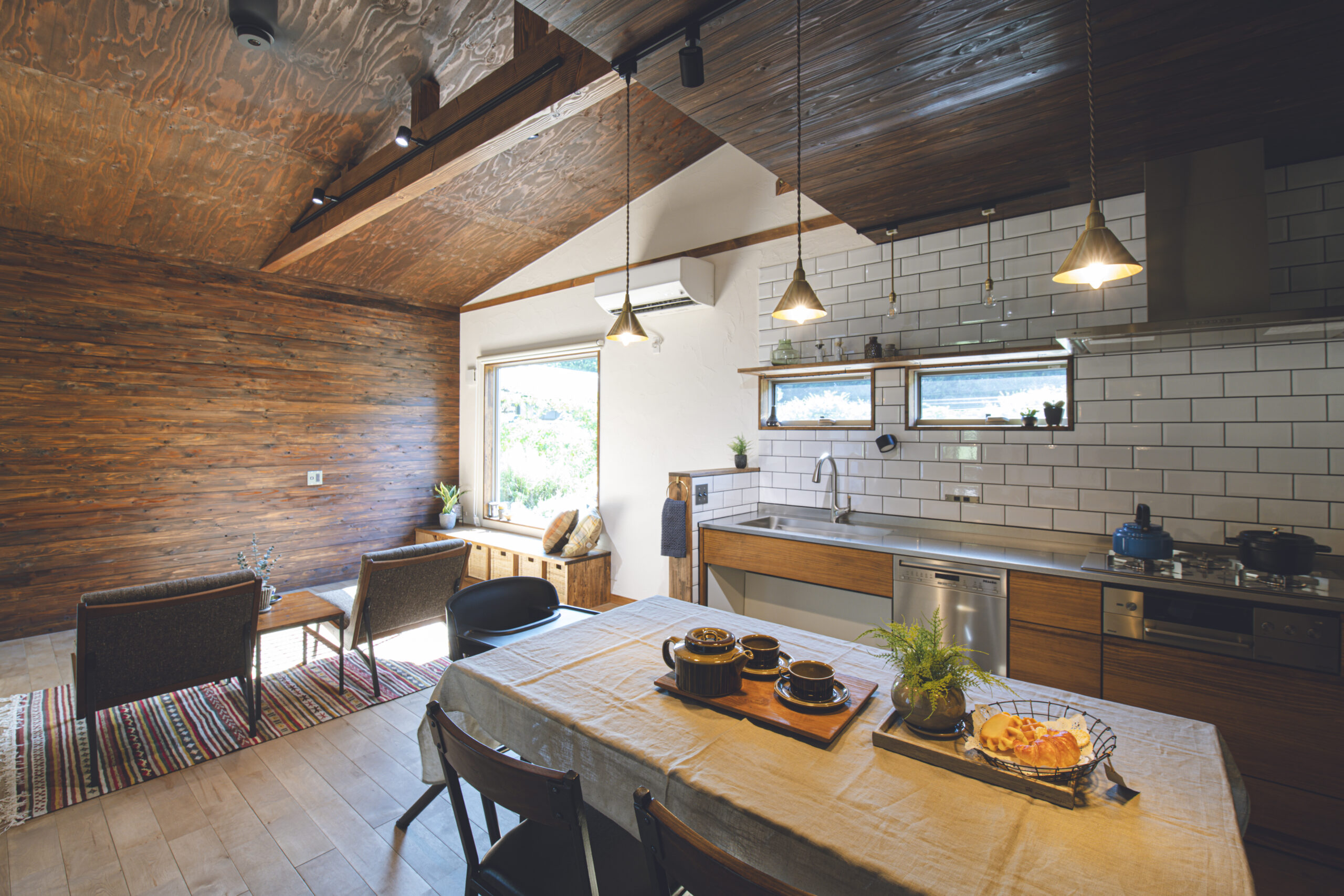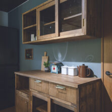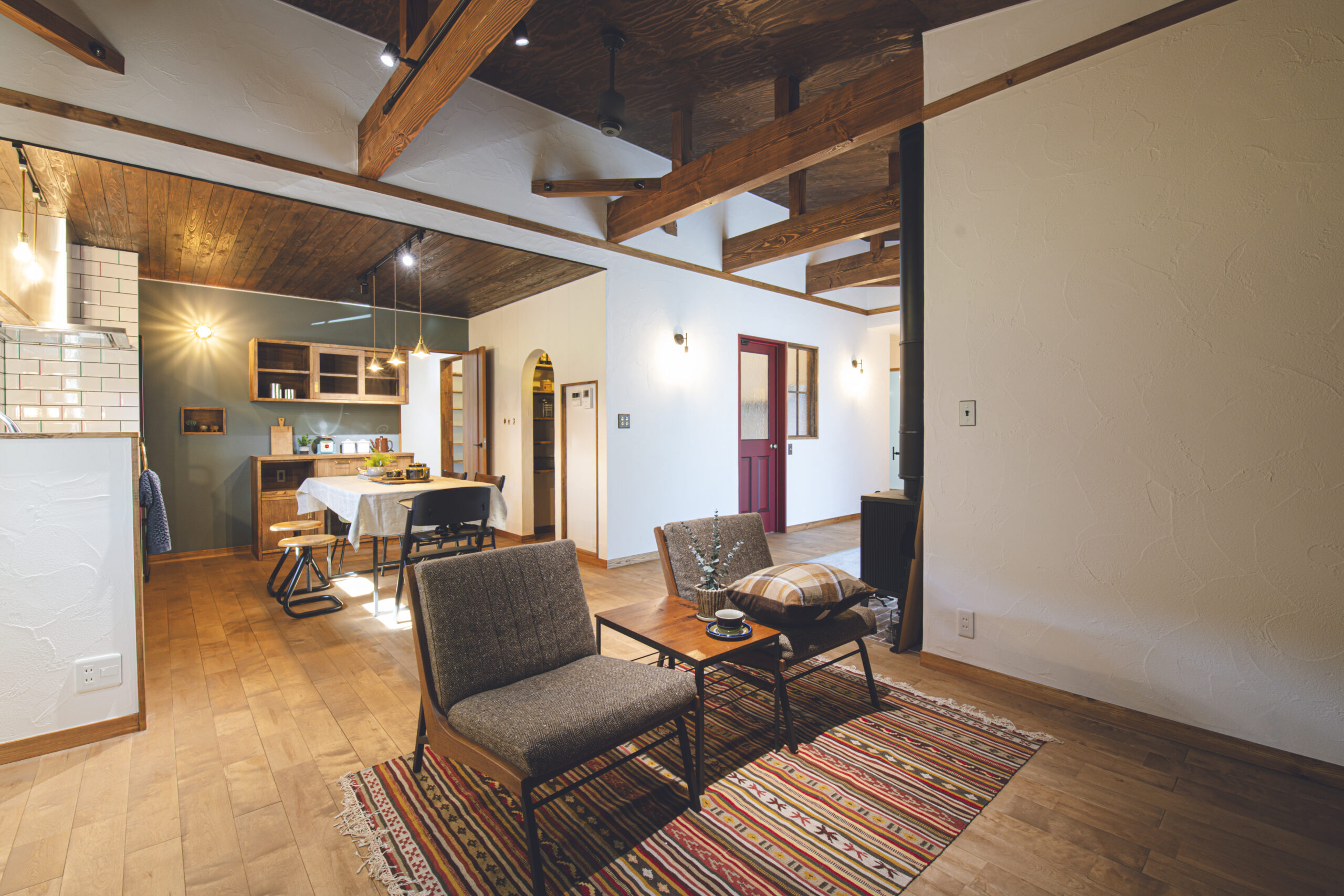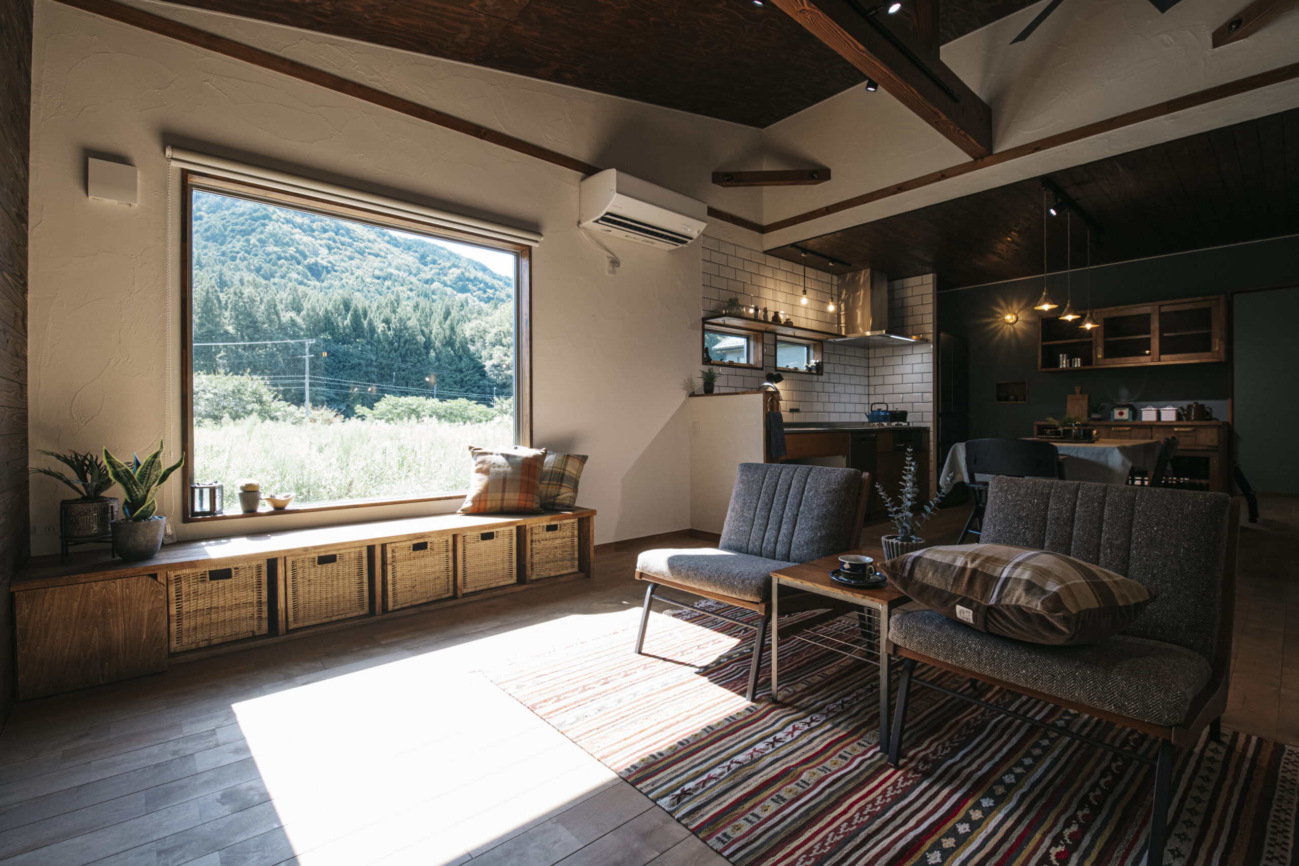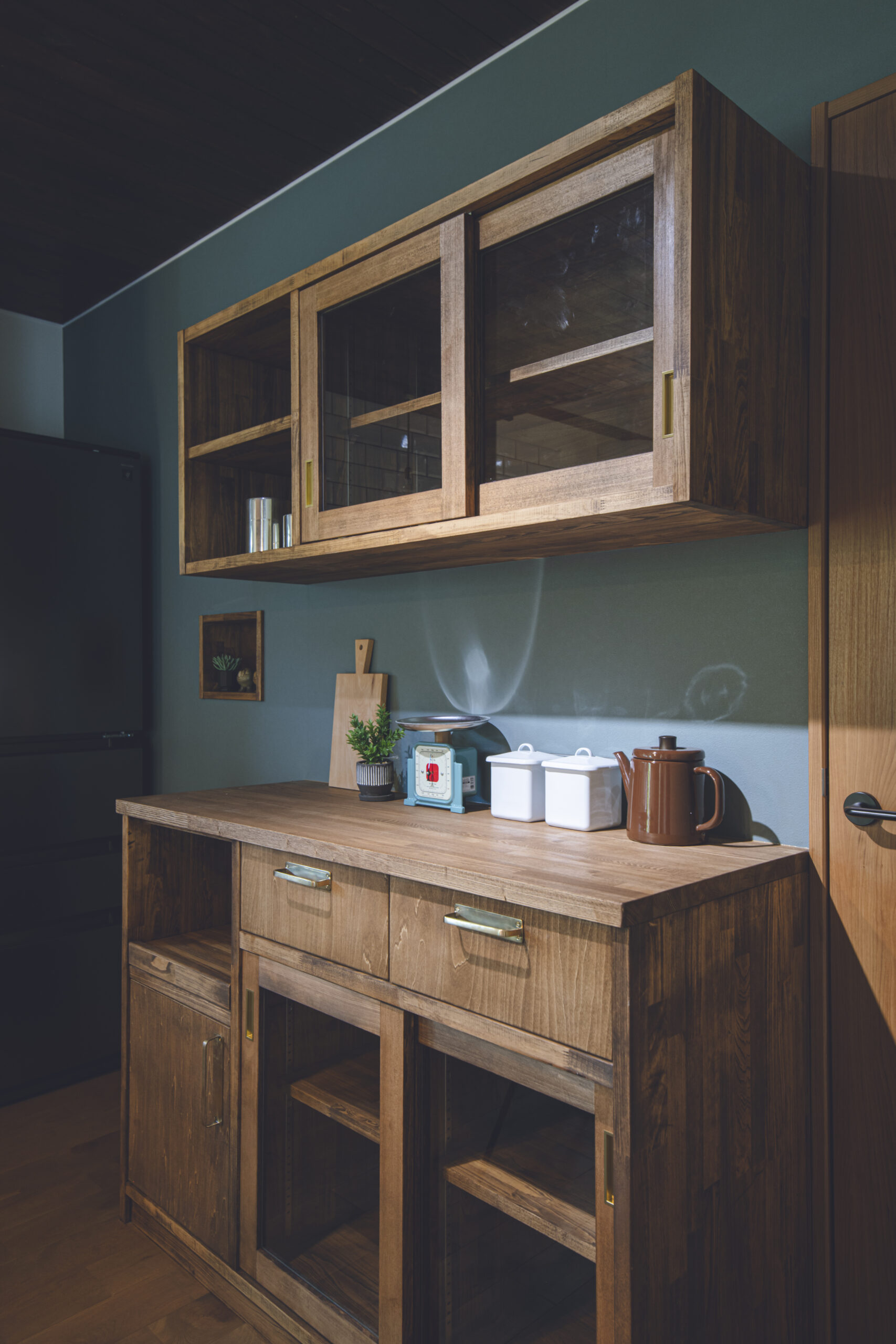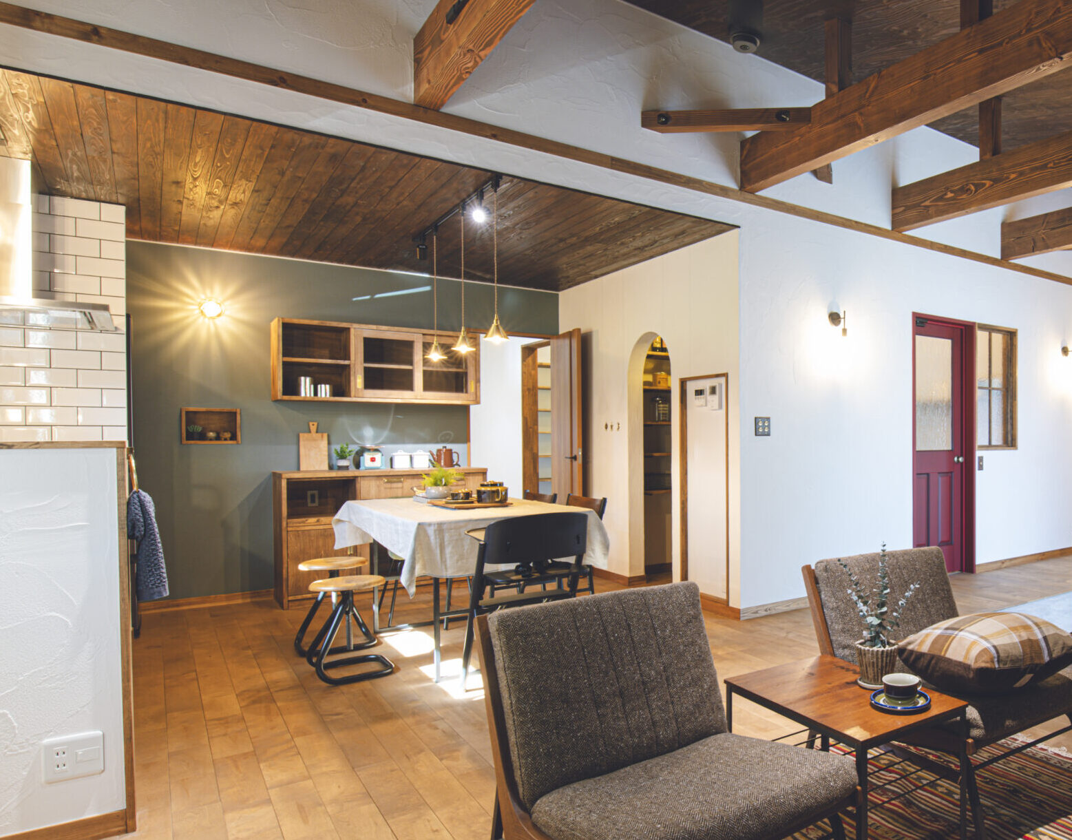 FIX窓下の造作ベンチと、キッチンの造作カップボードは、フローリングや建具の色に合わせて木材を厳選。統一感のある色合いが、壁のアクセントカラーとも美しく調和しています。そこにヴィンテージ風の照明が加わり、上質な山小屋の雰囲気を完成させています。