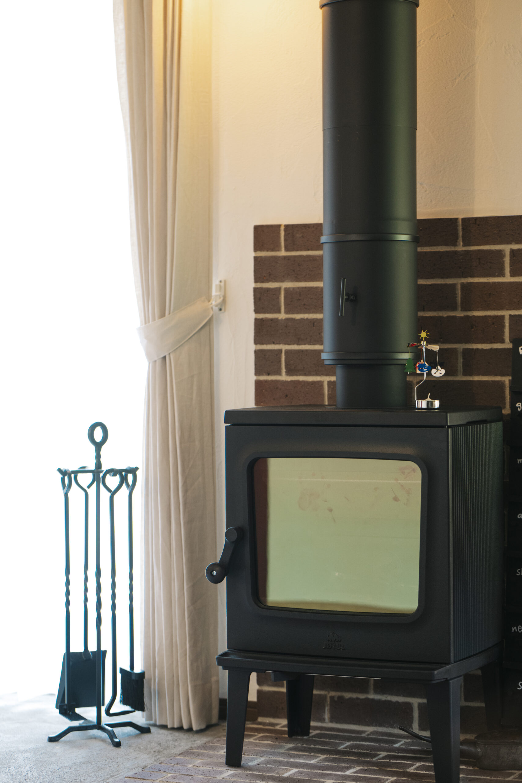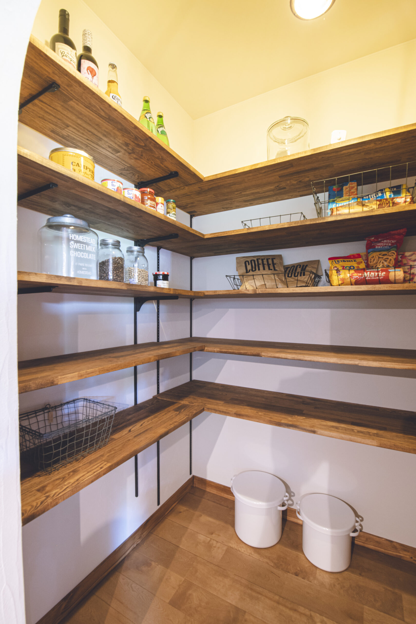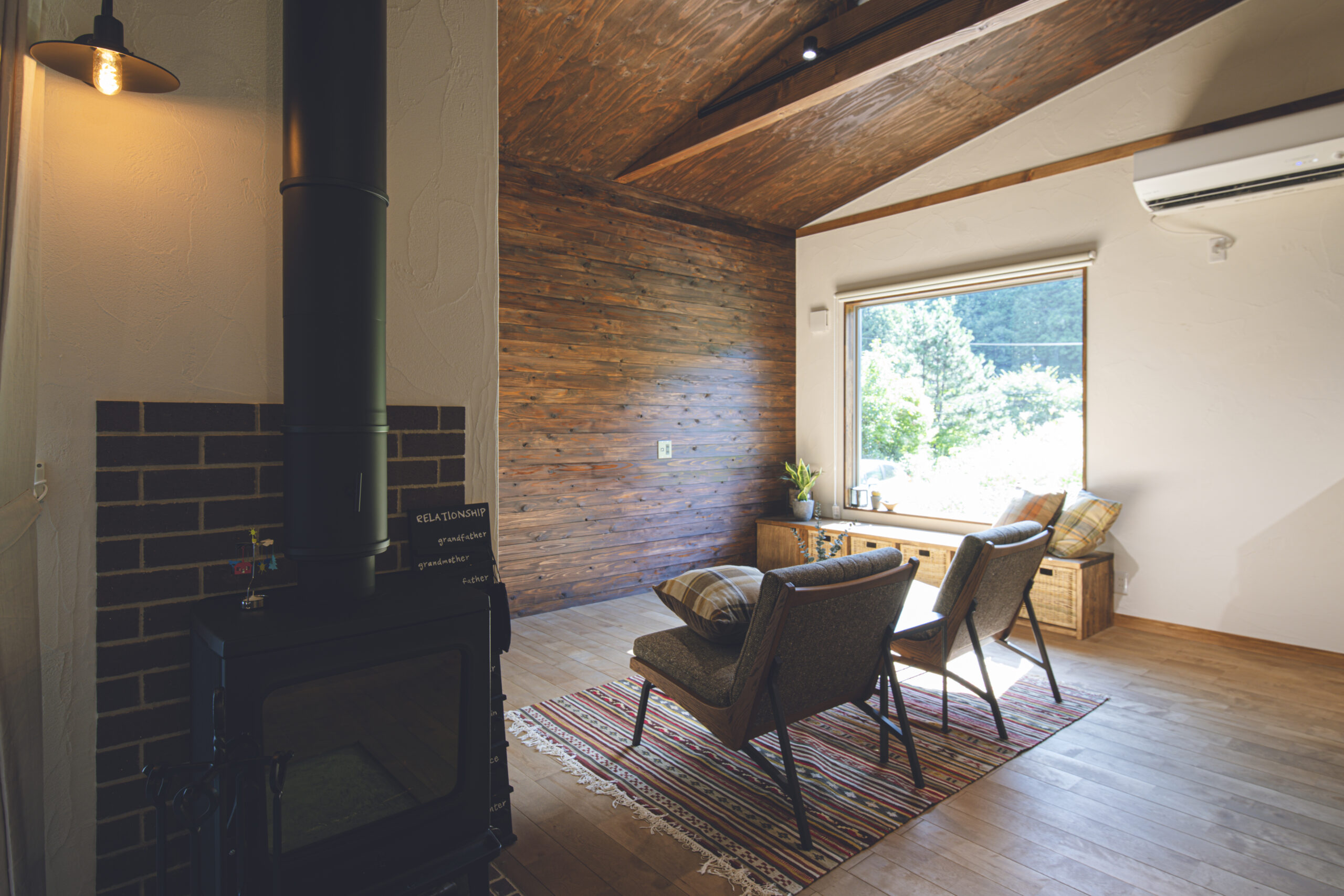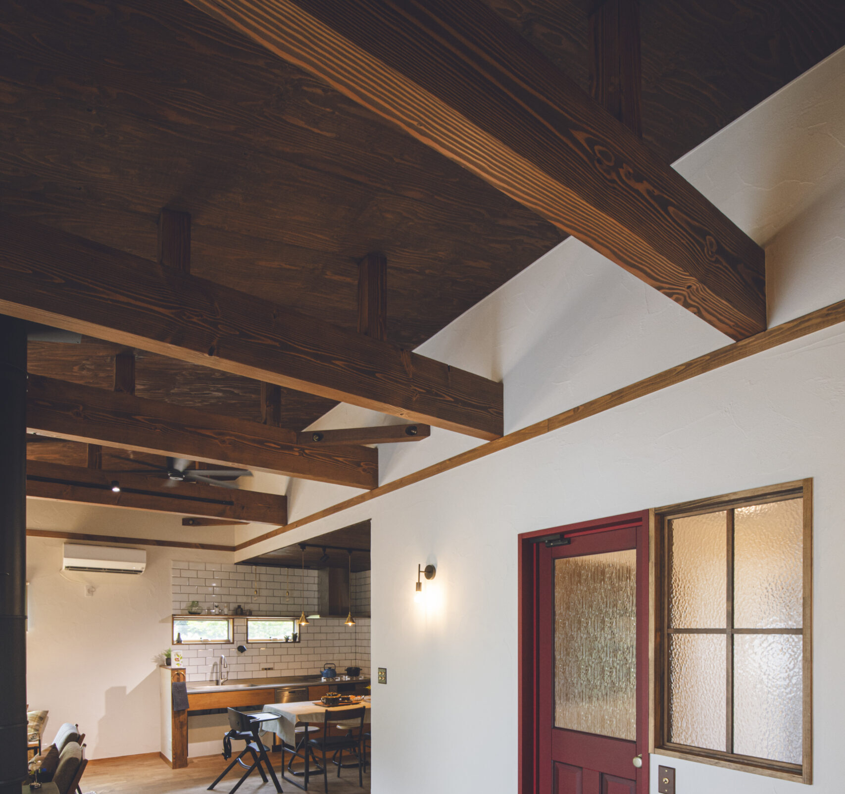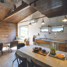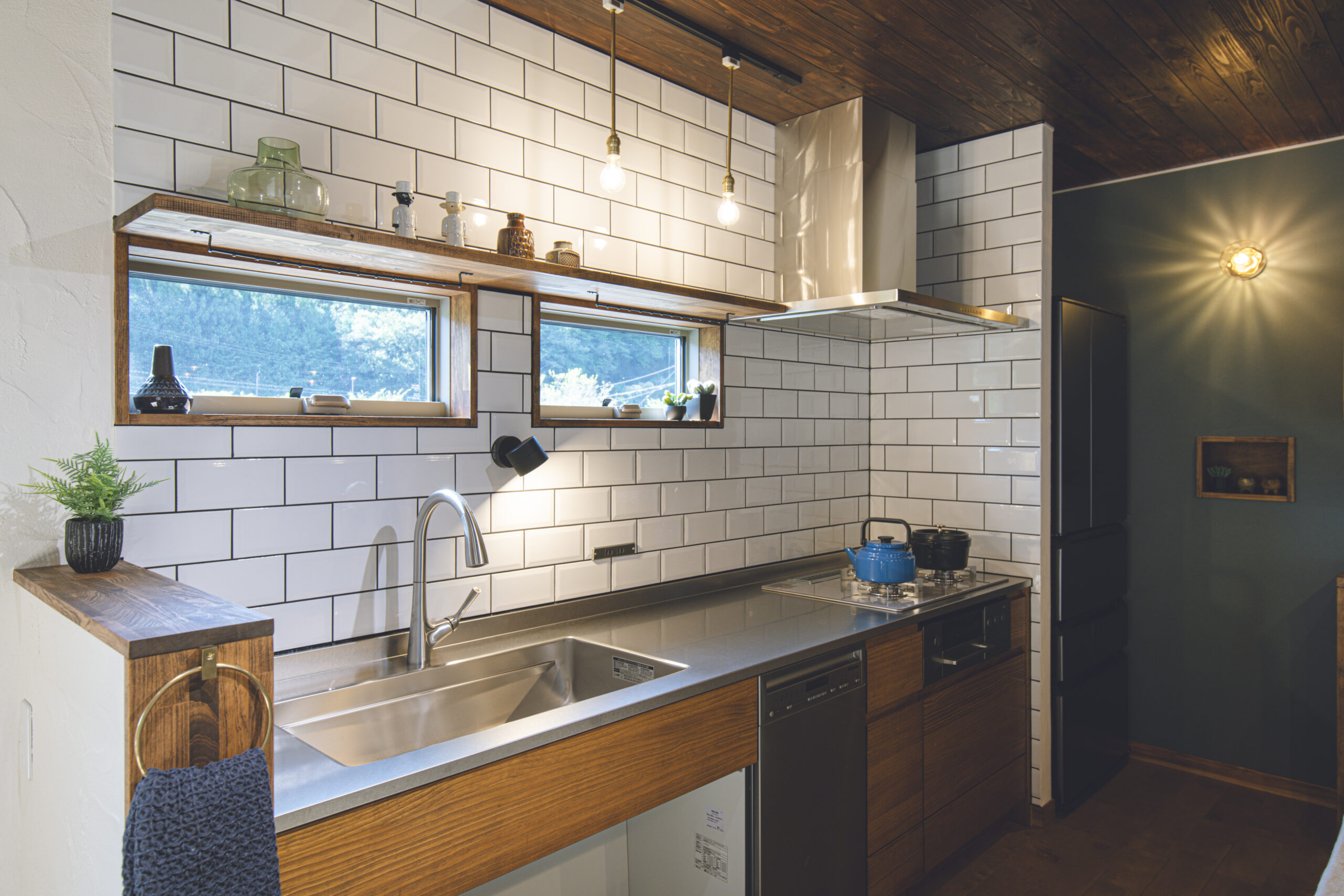 FIX窓下の造作ベンチと、キッチンの造作カップボードは、フローリングや建具の色に合わせて木材を厳選。統一感のある色合いが、壁のアクセントカラーとも美しく調和しています。そこにヴィンテージ風の照明が加わり、上質な山小屋の雰囲気を完成させています。