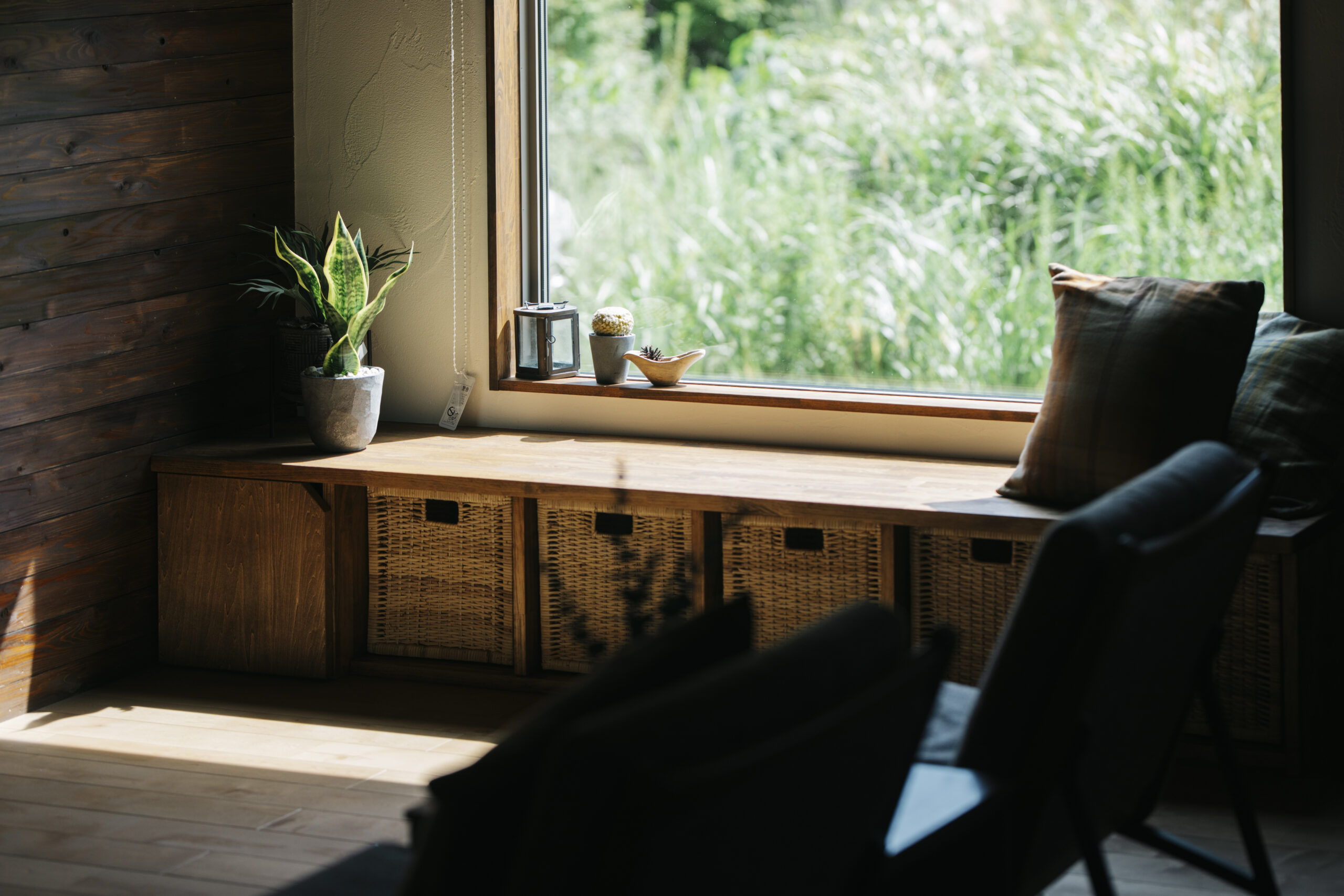 周囲の自然を切り取るように配置したリビングの大きなFIX窓は、四季折々の風景を室内に招き入れるアートとして楽しめます。窓下には造作のベンチ兼収納を設けました。天井に合板、テレビ壁には杉板を一面に貼り、木をふんだんに使った暖かみのある空間に。自然と調和し、心からくつろげるリビングです。