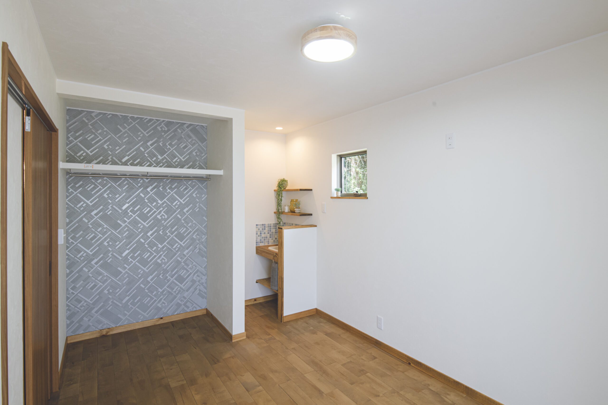 快適な家事動線を実現するため、水廻りを家の中心に配置しました。お母様の部屋、キッチン、寝室の全てから近く、生活動線がスムーズです。ランドリーとクローゼットを隣接させることで、洗濯→干す→しまうの家事動線も最小限に短縮。家族みんなが暮らしやすい、緻密な動線設計です。