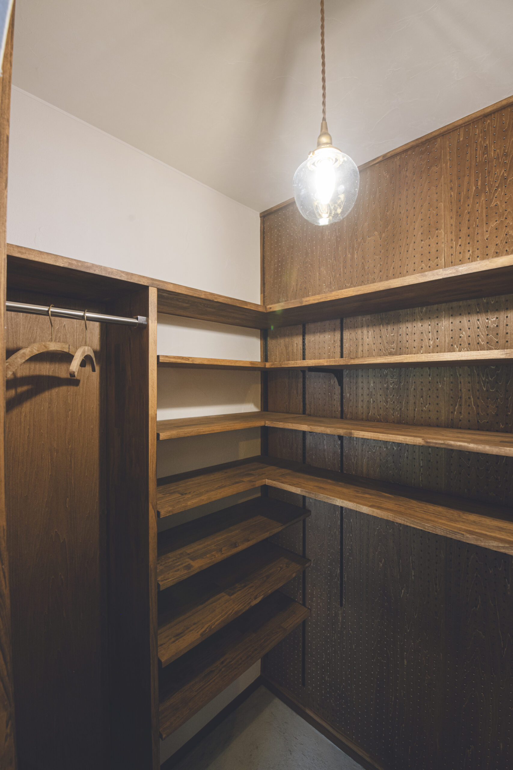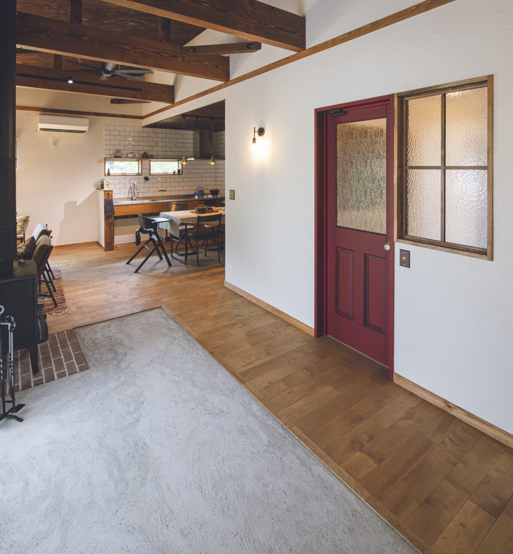 アウトドア好きのご主人のために設けた広い玄関土間は、キャンプ用品のお手入れや薪運びも楽々。土間からリビングへの段差をほぼフラットにすることで一体感を演出しています。さらに、玄関からリビングへと伸びる勾配天井が、開放的な広がりを創出。実用的な動線と、視覚的な空間の豊かさを両立させています。